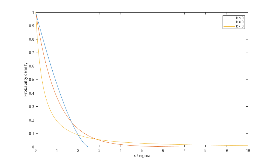 x = linspace(0,10,1000); plot(x,gppdf(x,-.4,1),'-', x,gppdf(x,0,1),'-', x,gppdf(x,2,1),'-'); xlabel('x / sigma'); ylabel('Probability density'); legend({'k < 0' 'k = 0' 'k > 0'});