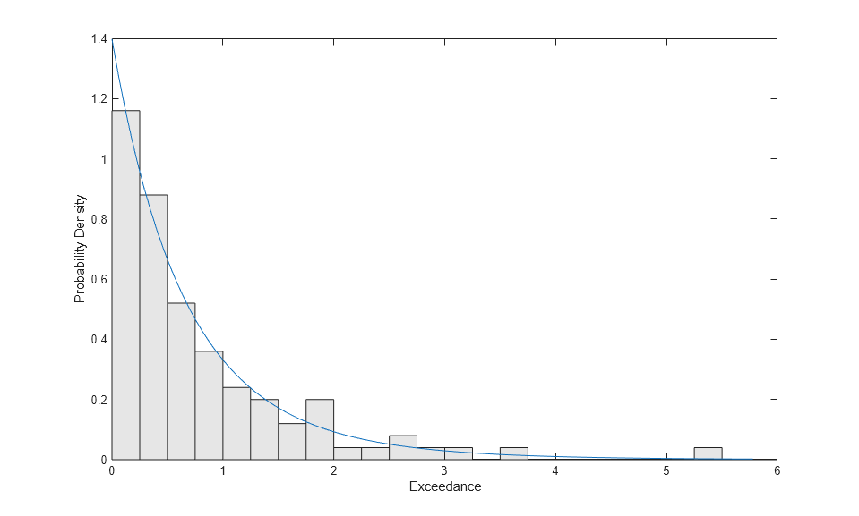 bins = 0:.25:7; h = bar(bins,histc(y,bins)/(length(y)*.25),'histc'); h.FaceColor = [.9 .9 .9]; ygrid = linspace(0,1.1*max(y),100); line(ygrid,gppdf(ygrid,kHat,sigmaHat)); xlim([0,6]); xlabel('Exceedance'); ylabel('Probability Density');