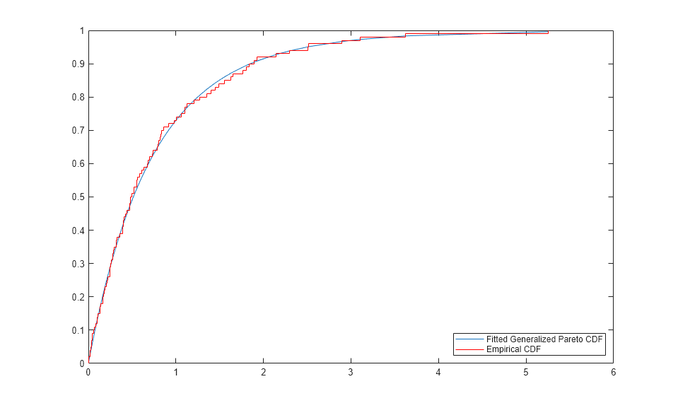[F,yi] = ecdf(y); plot(yi,gpcdf(yi,kHat,sigmaHat),'-'); hold on; stairs(yi,F,'r'); hold off; legend('Fitted Generalized Pareto CDF','Empirical CDF','location','southeast');