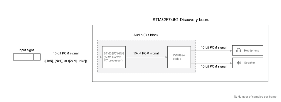 The Audio Output block writes the processed audio data to the audio device (headphones or speakers) that are connected to the processor on the STM32F746G/STM32F769I–Discovery™ board.