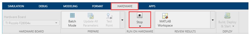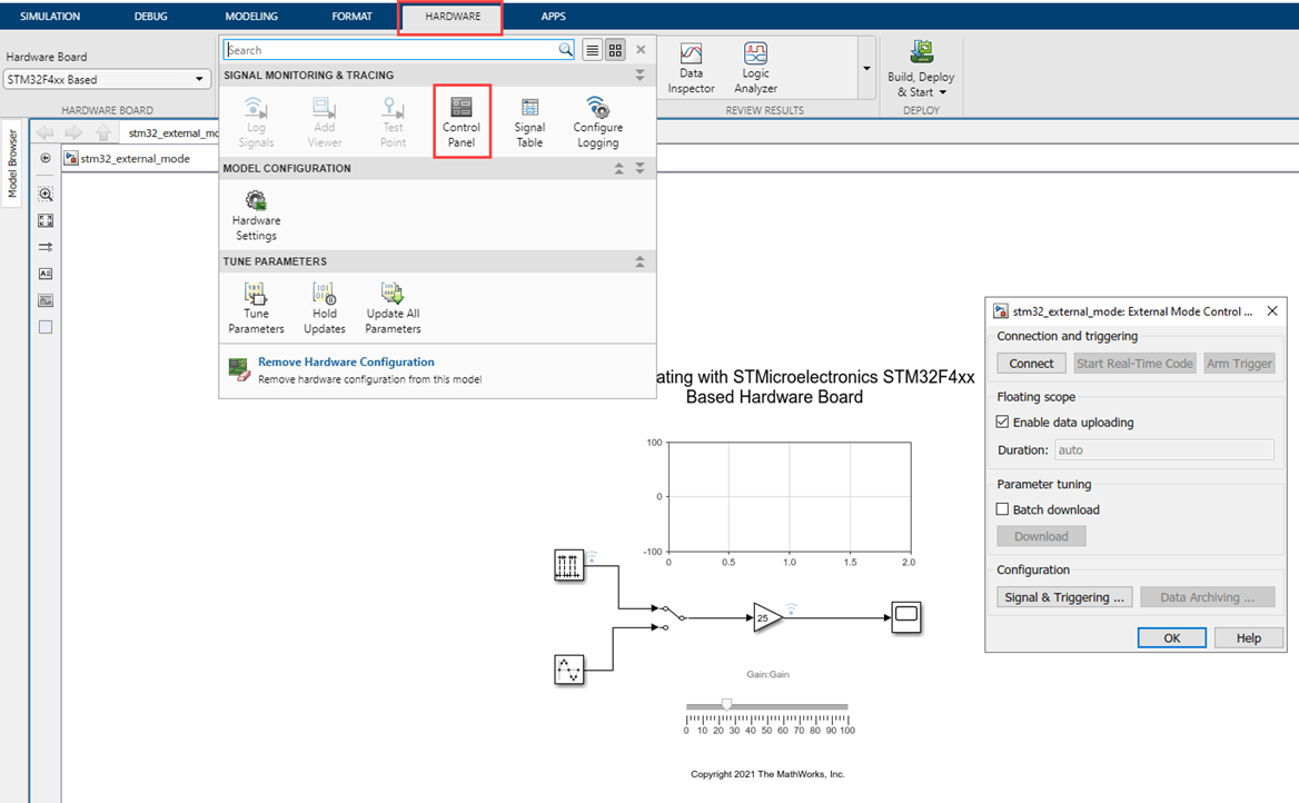 Note: At any point during the course of the simulation, you can open the External Mode Control Panel, as shown. The Hardware > control panel provides more options, such as the ability to connect or disconnect to the target without terminating the execution of the generated code.
