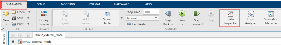 At this point, your model is running on the STMicroelectronics STM32 board and communicating with Simulink from Monitor & Tune. You can select the Simulation > Data Inspector button to view the logged signals, as shown.