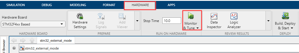 5. Go to Hardware tab, and click Monitor & Tune to configure the model for simulation.