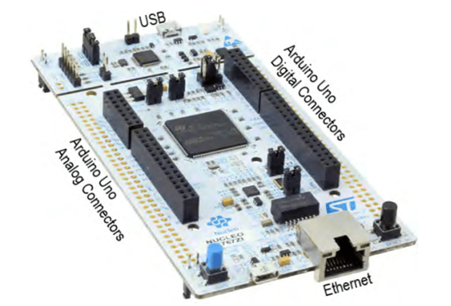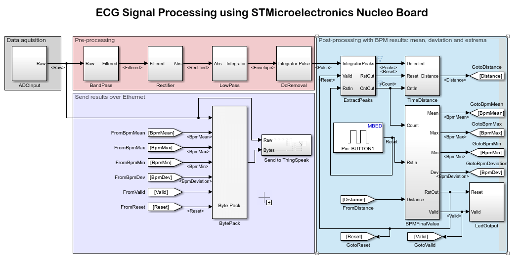 This example shows how to use the STM32 Nucleo F767ZI board to process an ECG signal input from an ECG sensor, extract the heart rate in beats per minutes (bpm), and send the ECG signal and heart rate to the ThingSpeak™ internet of things (IoT) analytics platform service.