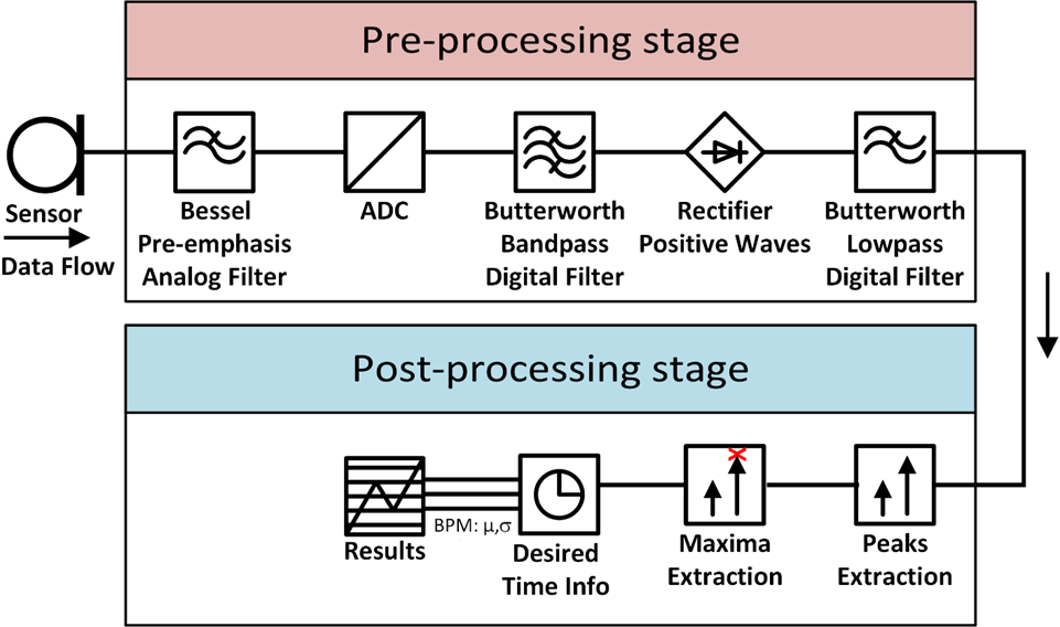 To get the number of beats per minutes (BPM) out of an ECG captured on a patient, a one minute measurement can be done and the high frequency peaks can be manually counted. To speed it up and still have an accurate result, a 30 second measurement can be realized. The sum of the counted peaks is then multiplied by two to get the final BPM value. The goal of the application software is to automate the process measuring the BPM. It first filters the ECG signal to separate and extract the high frequency peaks and then counts the number of peaks and compute the time difference between every pair of consecutive peaks. Based on this, it is then possible to come up with the signal processing chain represented in the block diagram.
