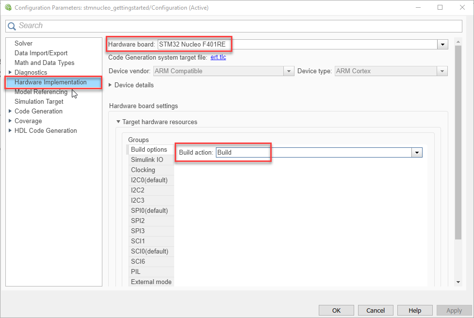 In this task, you will configure a simple model to build and generate out file for the STMicroelectronics Nucleo board.