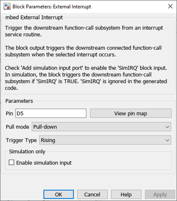 1. In the model, open the External Interrupt block, and ensure that the parameters are set as shown in the following image.