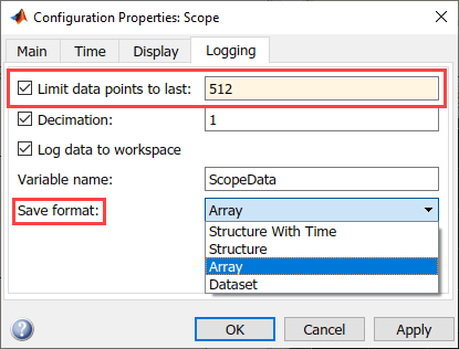 In the Configuration Properties: Scope dialog box, open the Logging tab, and select Log data to Workspace. Also select Limit data points to last and set a value of