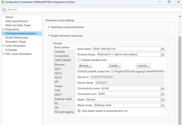 In the Hardware board settings pane, expand Target hardware resources and select SD card logging.