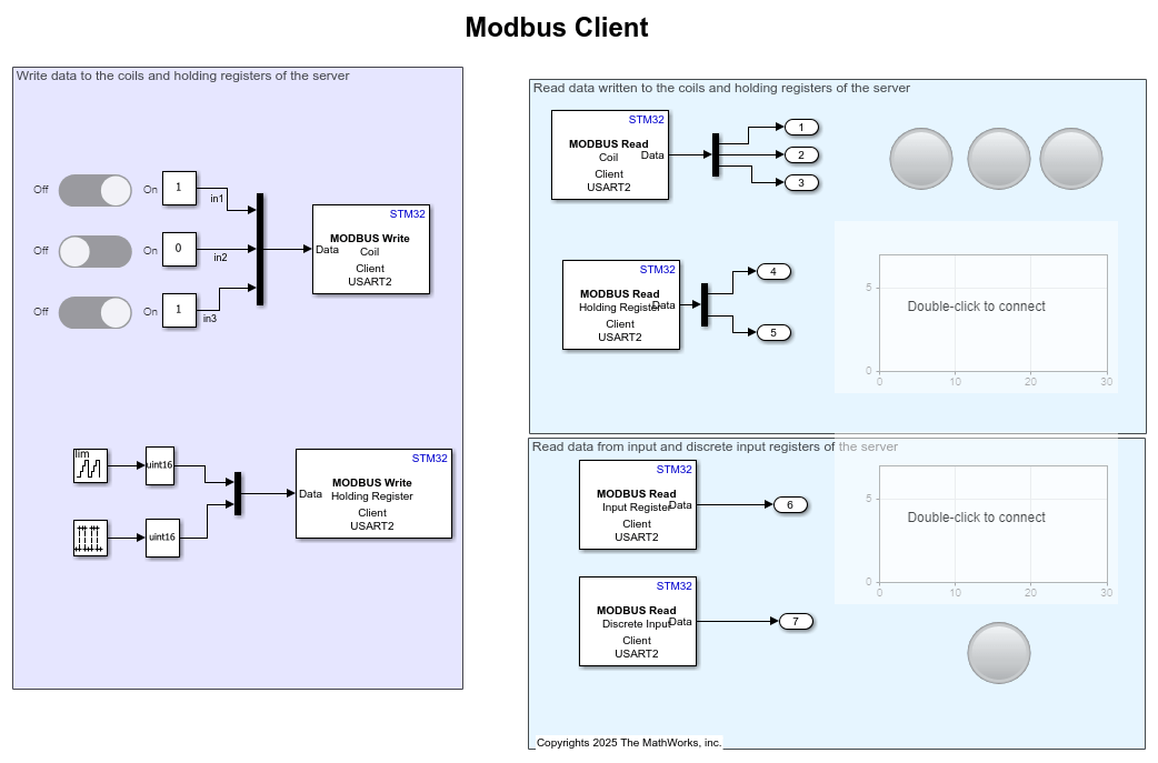 This example shows how to use the STM32™ Microcontroller Blockset to implement a MODBUS® asynchronous, serial communication between MODBUS client and server devices. It also shows the four modes of operation: Client Read, Client Write, Server Read, and Server Write.