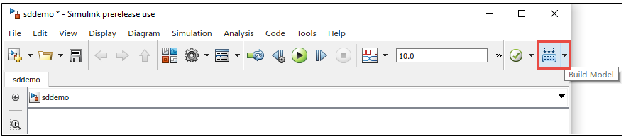 To deploy the code on the target hardware, in the model window, click the Build Model button. The lower left corner of the model window displays status while Simulink prepares, downloads, and runs the model on the target hardware. Wait for the logging to stop.
