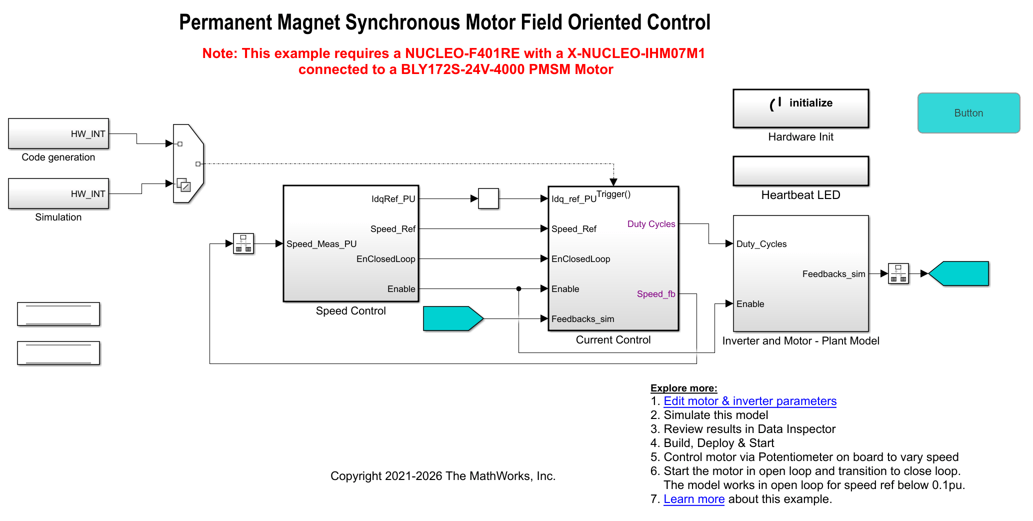 You can use the mcb_pmsm_foc_sensorless_nucleo_f401re or mcb_pmsm_foc_sensorless_nucleo_g474re model with the X-NUCLEO-IHM07M1 expansion board for both simulation and code generation. You can also use the open_system command to open the Simulink® models. For example, use this command for a STM32 Processor based Boards: