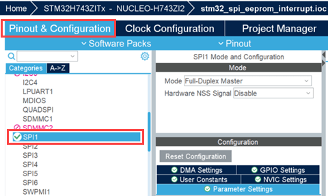 SPI blocks are configured with the Data bits parameter set to 8 to send the 8-bit opcodes and write/read the 8-bit data. Set the Hardware NSS signal to disabled provided by the SPI peripheral in STM32CubeMX configuration parameters under SPI module, to ensure the slave is not deselected between data transfers.