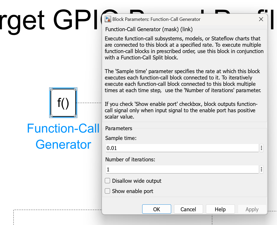 • Similar to GPIO Based Profiling, configure the sample time parameter of the Function-Call Generator to the sample time at which the algorithm was originally triggered.