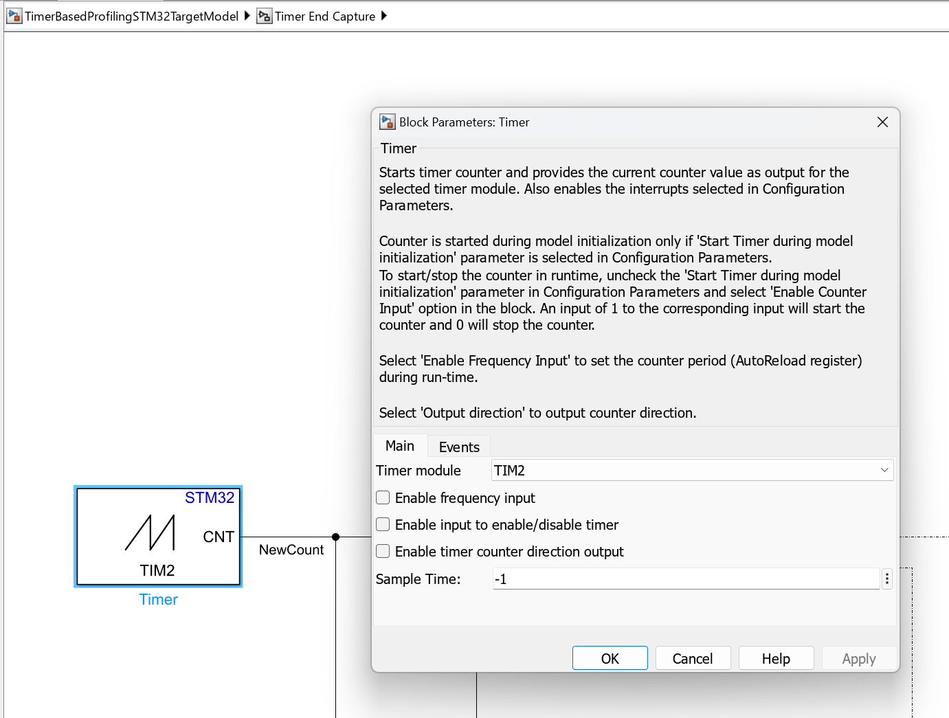 Double-click the blocks to open their block parameter configurations. Ensure that the timer module used in the Initialize Function, Timer Start Capture, and Timer End Capture subsystems matches the one configured for profiling in STM32CubeMX.