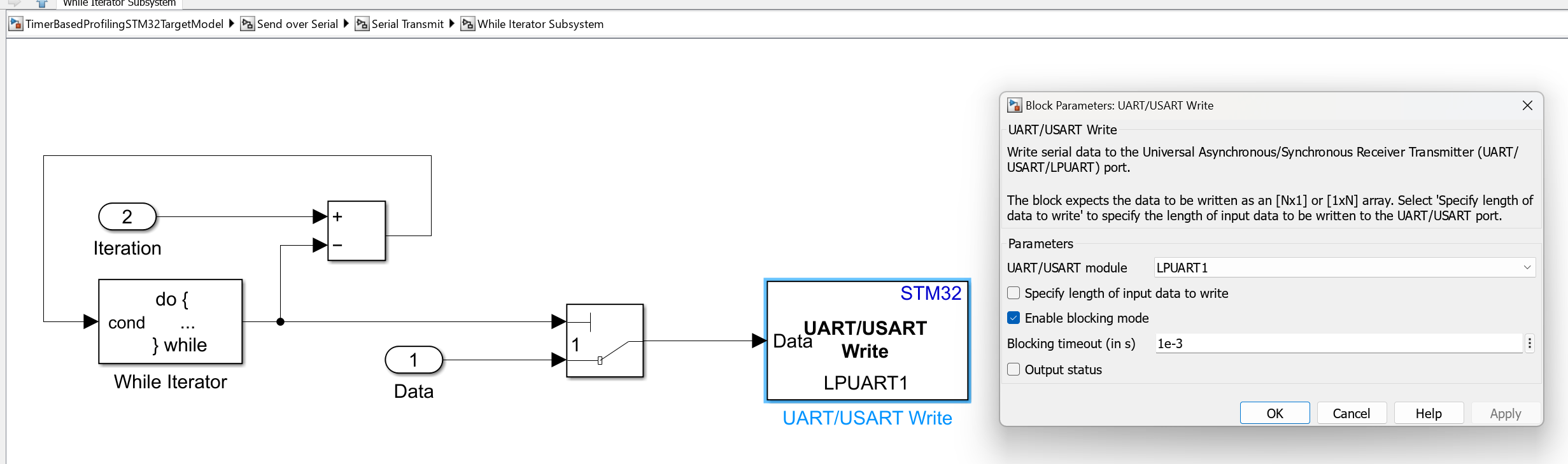 The serial module used for communication must be selected in the UART/USART Write block located at the following path: TimerBasedProfilingSTM32TargetModel > Send over Serial > Serial Transmit > While Iterator Subsystem > UART/USART Write.