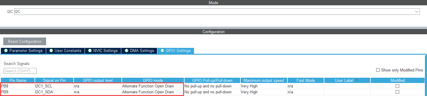 3. In AVR targets, for the I2C calls to work from within ISR, place sei(); inside the ISR. The sei() is added to the model using System Output block. The sei() is guarded to be included only for AVR targets and not the ARM® targets. Use this I2C configuration in STM32 CubeMX.