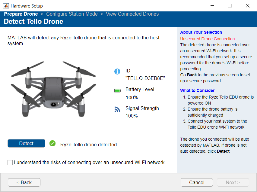 MATLAB이 컴퓨터에 연결된 Ryze Tello EDU 드론을 표시합니다. MATLAB이 드론을 자동으로 감지하지 않으면 Detect Tello Drones 창에 있는 Detect 버튼을 클릭합니다. 기본적으로는 감지된 드론의 비밀번호를 설정할 때까지 설정 화면이 다음 화면으로 넘어가지 않습니다. I understand the risks of connecting over an unsecured Wi-Fi network를 선택하면 비밀번호를 설정하지 않고 계속 진행할 수 있지만, 비밀번호를 설정하는 것이 가장 좋은 방법입니다. 드론 비밀번호를 설정하려면