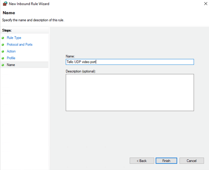 Ryze Tello 드론은 FPV 비디오를 UDP 포트 번호 11111로 스트리밍합니다. 이 포트는 기본적으로 Windows 방화벽에서 차단되어 있습니다.