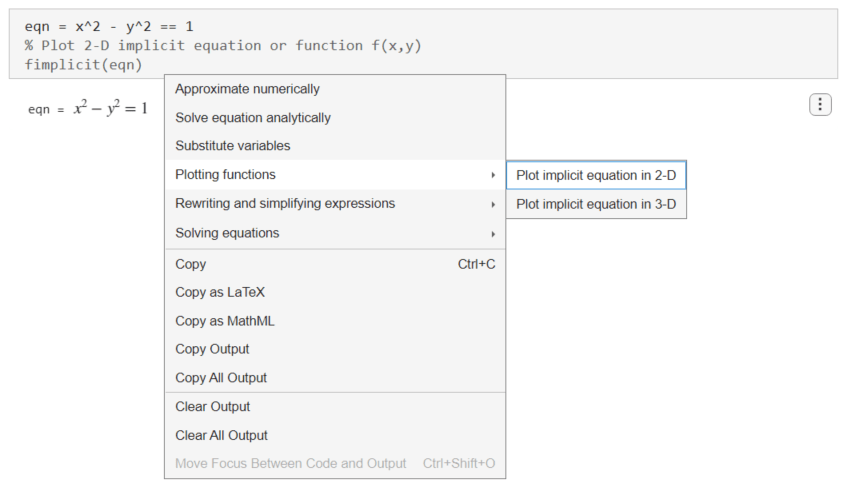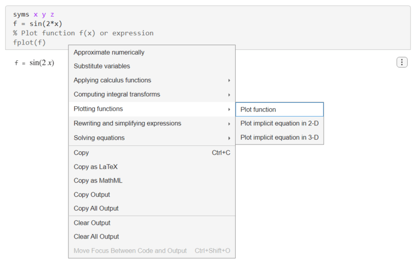 R2021b부터, 라이브 편집기에서 기호 출력값을 생성하는 코드를 실행하면 라이브 편집기는 출력값에 맞춰 다음 단계 작업을 제안하는 상황별 메뉴를 제공합니다. 이 제안 메뉴를 열려면 마우스로 기호 출력값을 가리키고 세 점 아이콘