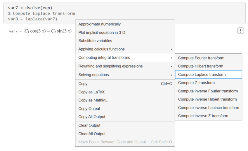 다음으로, 해의 라플라스 변환을 구합니다. dsolve의 출력값을 마우스 오른쪽 버튼으로 클릭하고 적분 변환 계산 > 라플라스 변환 계산을 선택합니다.