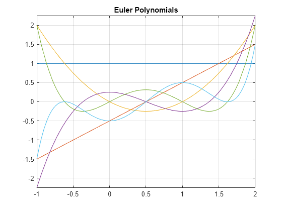 syms x fplot(euler(0:5, x), [-1 2]) title('Euler Polynomials') grid on