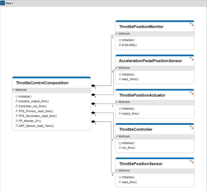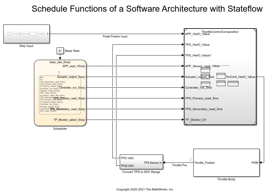 스로틀 바디와 함께 스로틀 제어 시스템을 시뮬레이션하려면 Model 블록을 사용하여 시스템 모델의 소프트웨어 아키텍처 모델을 참조합니다. ThrottleControlSystem 모델에는 소프트웨어 아키텍처 함수에 대해 더 복잡한 스케줄링을 모델링하기 위한 Stateflow® Chart 블록도 포함되어 있습니다.
