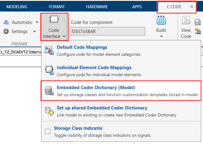 Go to C Code > Code Interface and click Embedded Coder Dictionary (Model).