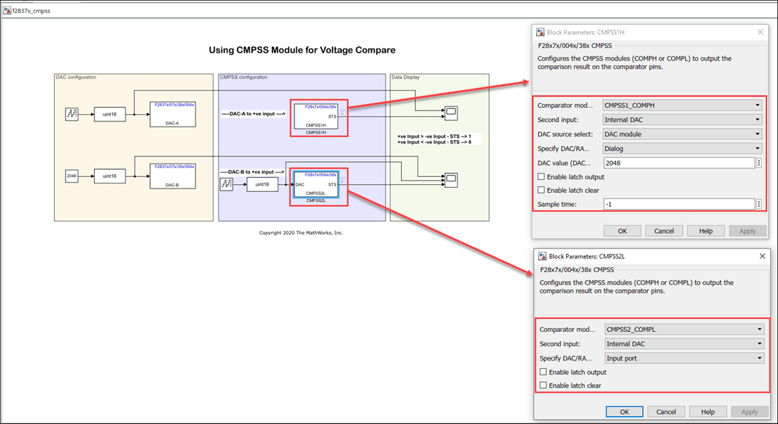 3. The following are the comparator configurations performed in the model. Ensure that the specified parameter values are the same if you want to run this example for other hardware board.