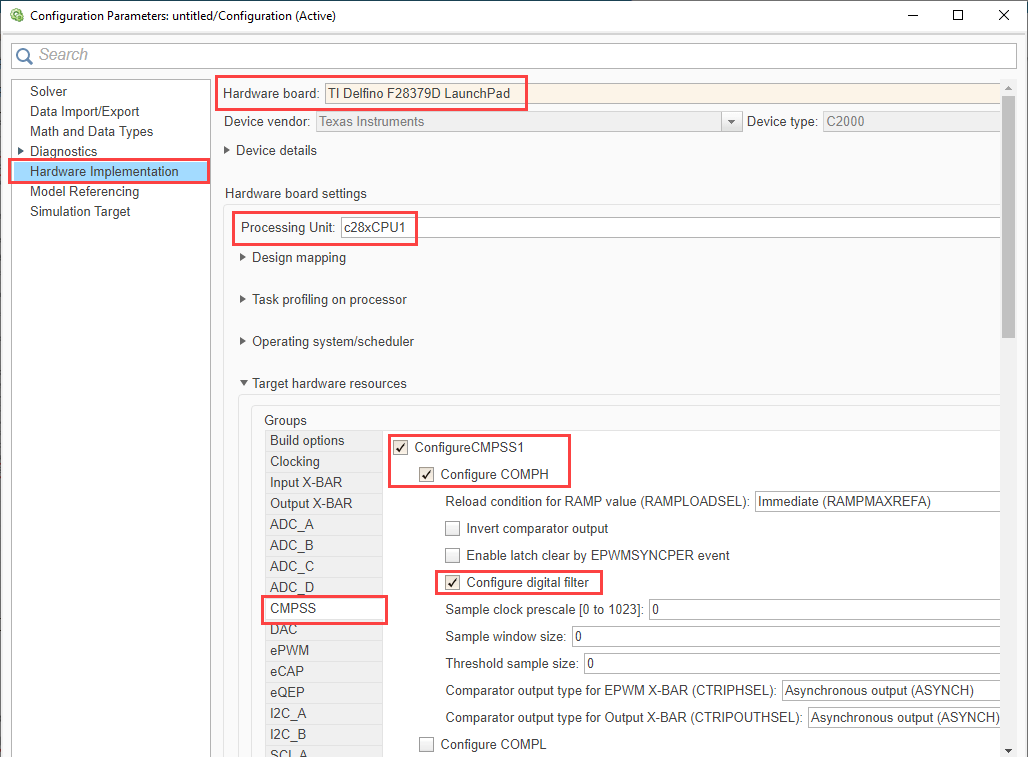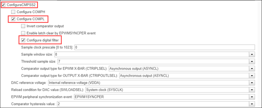 Following are the CMPSS block configurations done for this model. Double-click on the blocks to open block parameter configurations. Ensure the specified parameter values are the same if you want to run this example for other hardware board