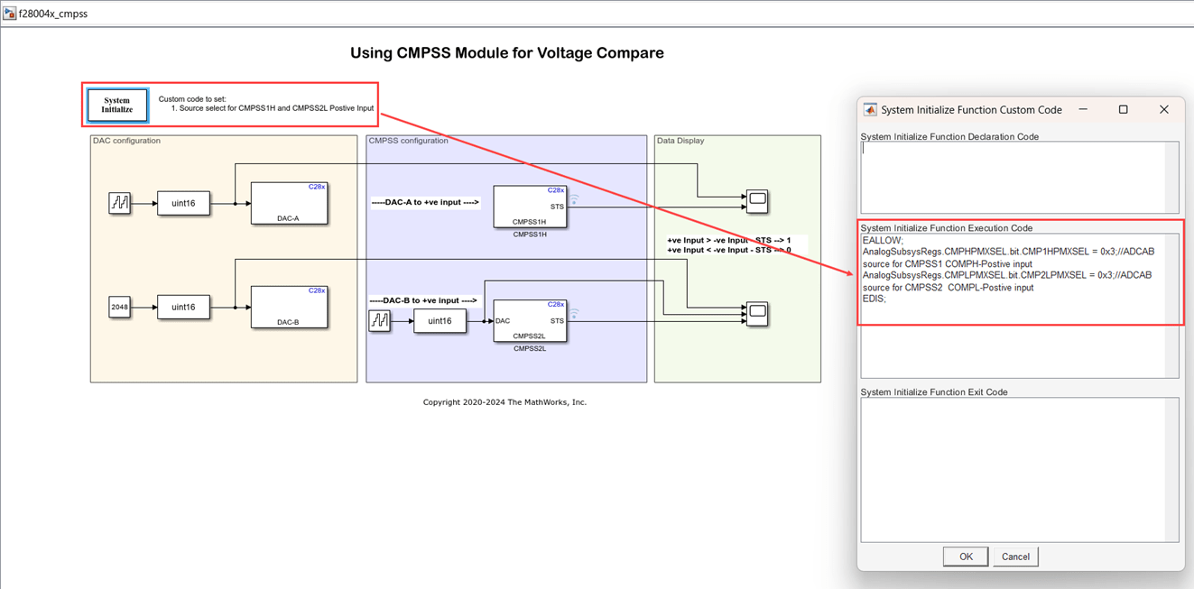In the f28004x_cmpss model, the System Initialize block configures the source for CMPSSIH and CMPSS2L positive input as shown in the image. For more information, see CMPSS.