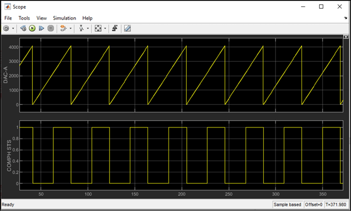 DAC-A voltage value ranges from 0-4095 which gives a Ramp voltage(0-3.3v) on the DAC-A pin. This voltage is fed to positive input of the CMPSS1 COMPH comparator.