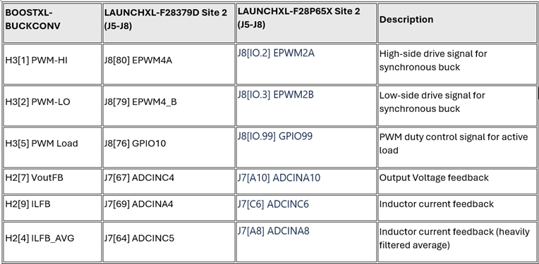 Connect the Digital Power Buck Converter BoosterPack (BOOSTXL-BUCKCONV) to the Texas Instruments Delfino F28379D LaunchPad or the Texas Instruments F28P650D LaunchPad as detailed in the following table.