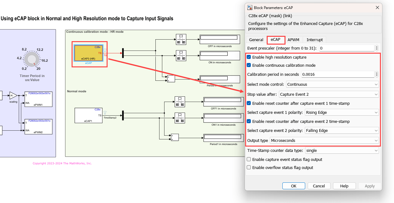 This example shows how to use high resolution mode (HRCAP) in eCAP block to capture the input signals using C2000™ Microcontroller Blockset.