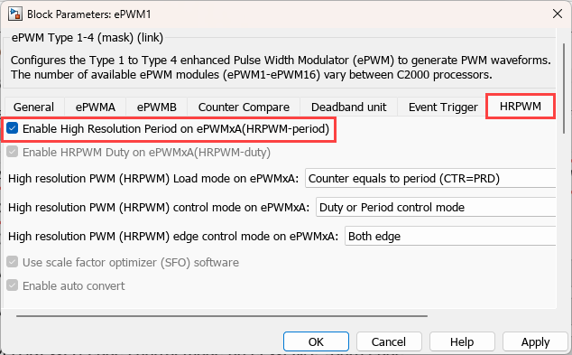 3. In the HRPWM tab, Select Enable high resolution period on ePWMxA (HRPWM-period).