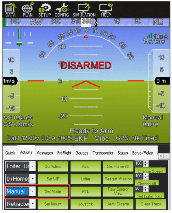 Open Mission Planner. Select the Data tab, go to Actions tab, select Manual mode from the drop-down list, and then click Set Mode.
