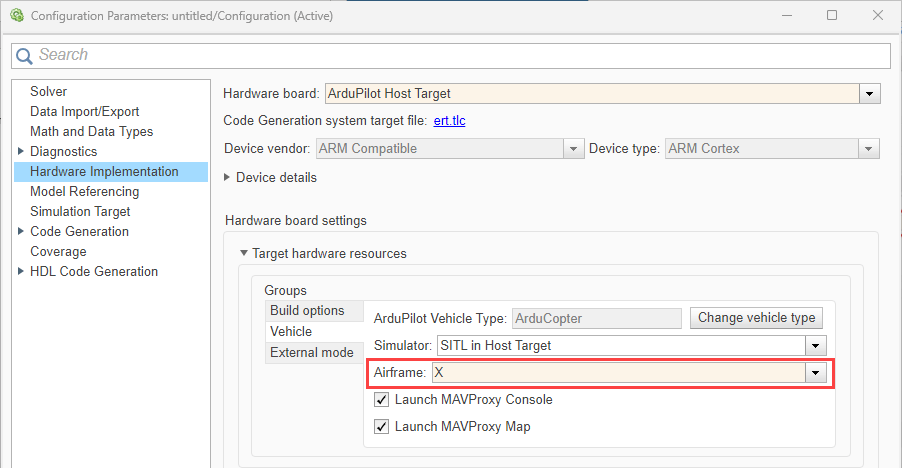 3. In the Configuration Parameters dialog, set the Airframe to X to match the SITL plant.