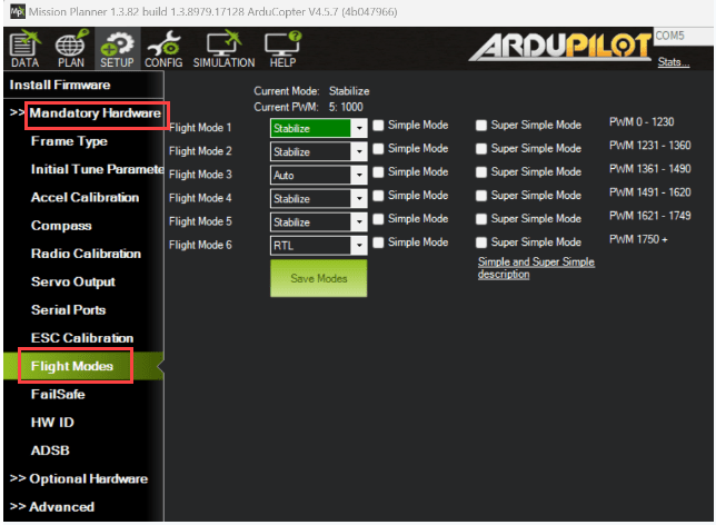 iii. Go to Setup > Mandatory Hardware > Flight Modes in Mission Planner to map flight modes to different RC input ranges. This allows you to map specific flight modes to different ranges of values on the assigned RC channel.