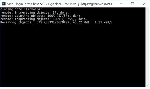 5. If you selected Clone PX4 repository and Start Simulation and clicked Finish, a bash shell is launched which starts cloning the firmware.