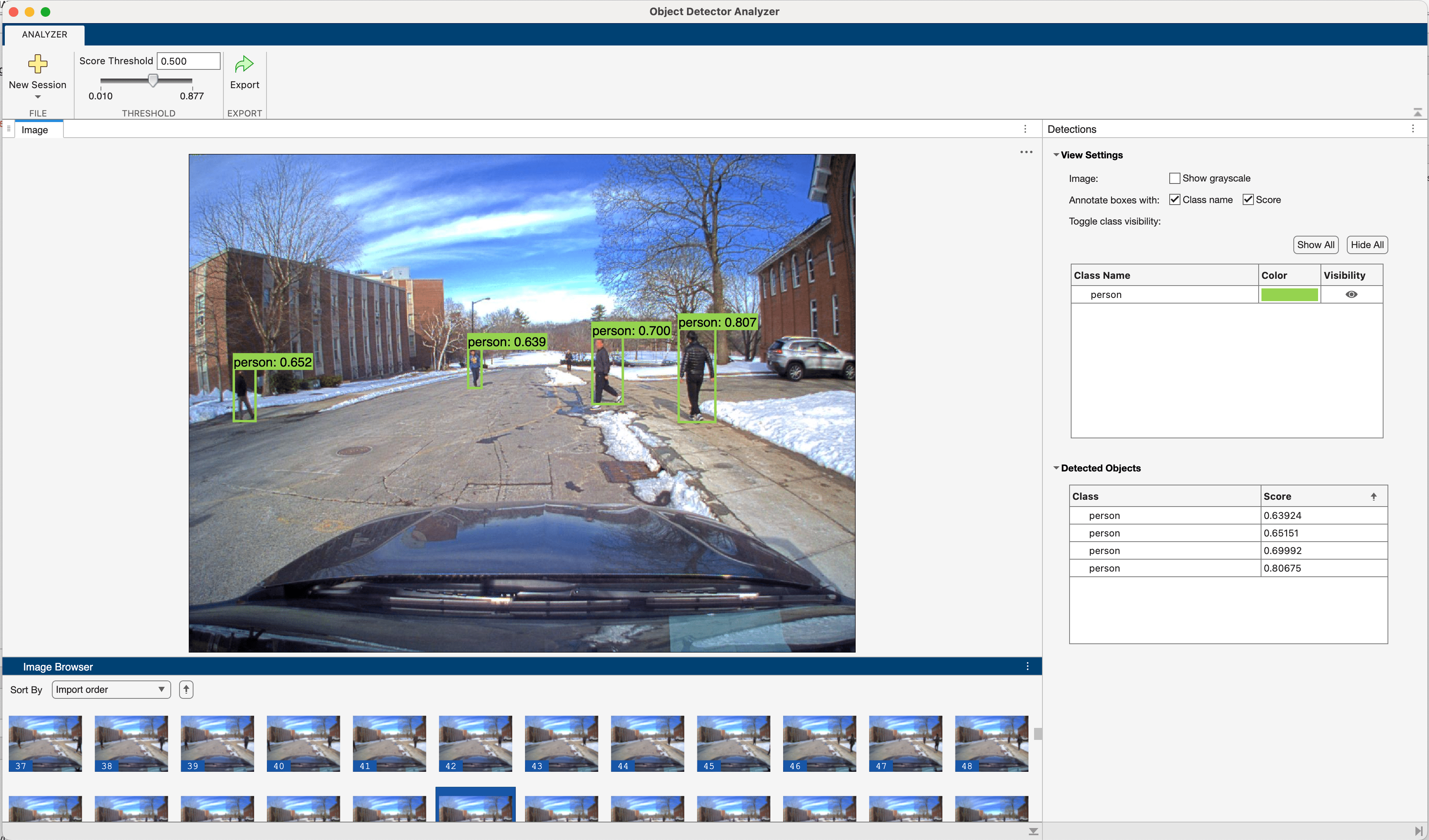 Run a pretrained object detector in the app, or import precomputed object detection results from the workspace. For a list of supported object detectors to run in the app, see Run Supported Object Detectors. For information about the format of precomputed detection results, see Import Precomputed Detection Results.