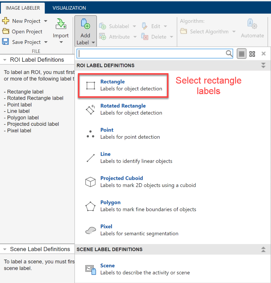A label definition specifies the name, color, and numeric index of a label. To label rectangular ROIs for object detection, on the Image Labeler tab of the app toolstrip, select Add Label, and, under ROI Label Definitions, select Rectangle.