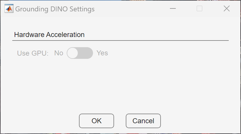 To use a GPU device, in the Grounding DINO section of the app toolstrip, click Settings. The app opens the Settings dialog box. To use a GPU, toggle the Use GPU button to Yes. Click OK.