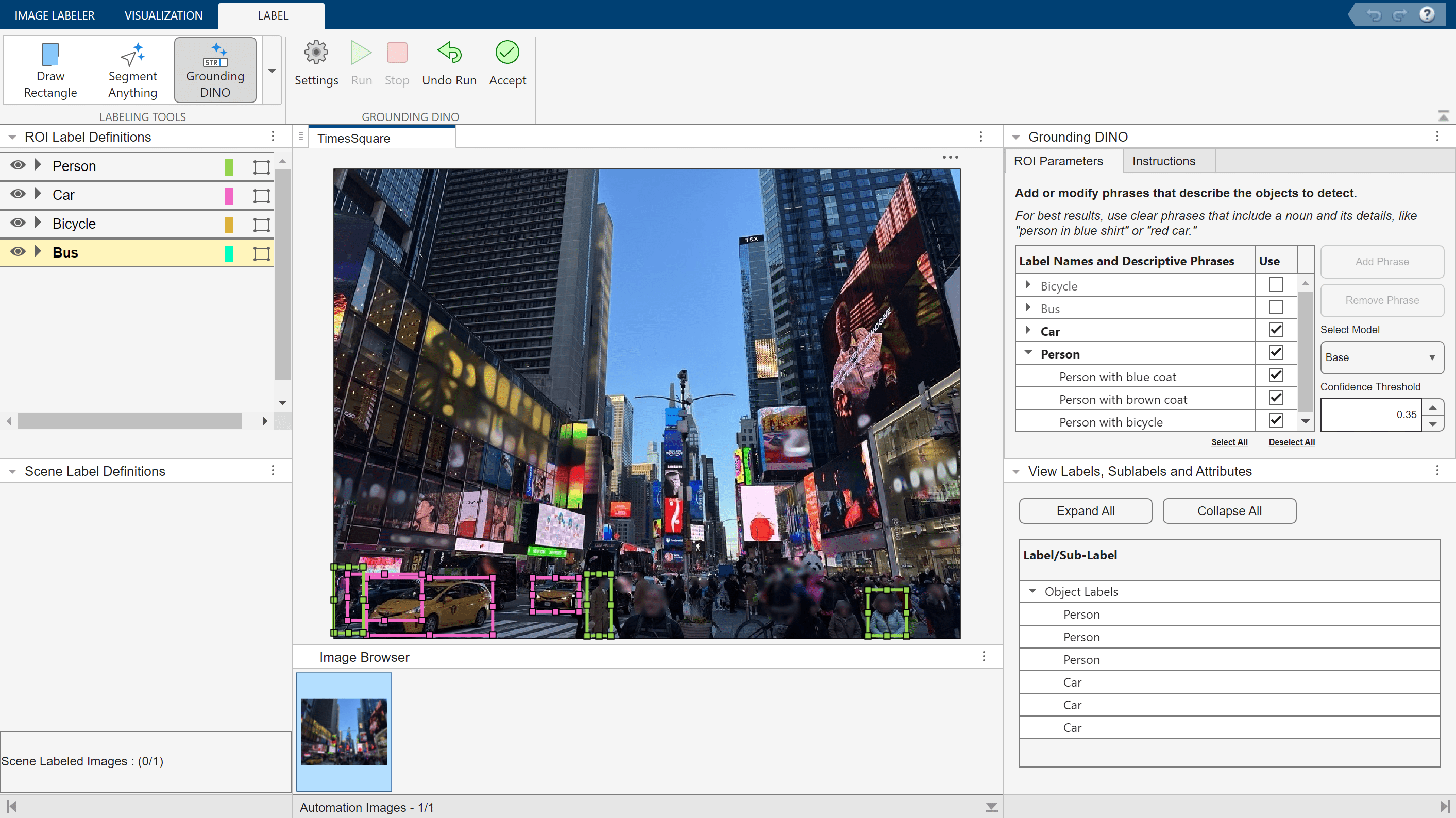 When you are done creating descriptive noun phrases, click the Run in the Grounding DINO section of the app toolstrip to label the specified objects. The Image Labeler app automatically generates rectangle ROI labels for each object, outlining the labeled objects in the color associated with the label. You can view a list of the generated rectangular ROI labels in the View Labels, Sublabels, and Attributes bottom-right panel. The label names are not specific to the descriptive noun phrases.