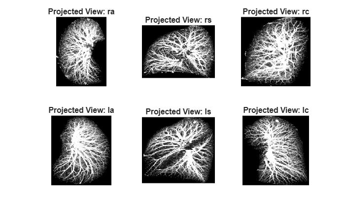 tiledlayout(2,3) for viewIdx = 1:size(imgArrayPostMIP,2) nexttile imshow(imgArrayPostMIP{viewIdx}) title("Projected View: " + projectionNames(viewIdx)) end