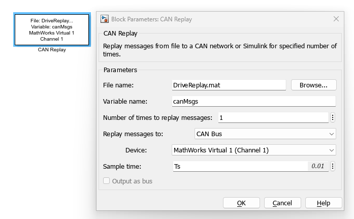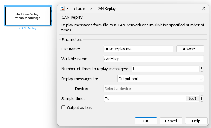 The CAN Replay block allows you to inject CAN data as inputs to a Simulink® model. The data is available in a MAT file, in the form of a variable of struct type with defined fields. For more information, see Log and Replay CAN Messages.