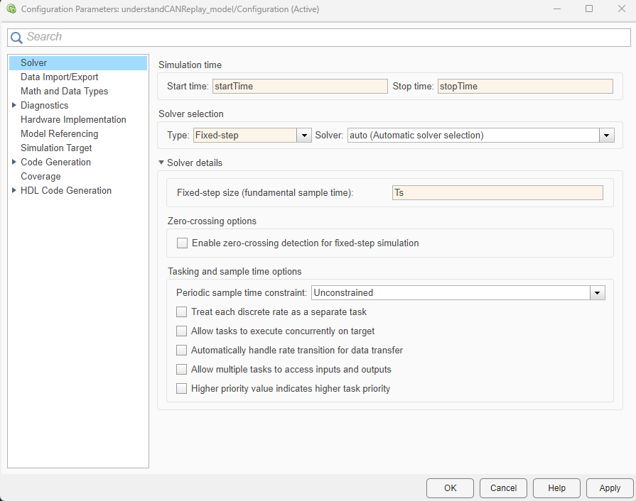 Note the usage of the sample time, Ts, and the decision to replay the messages only once. In order for the simulation to be compatible with these choices, it is necessary to set the Configuration Parameters of the model as follows: