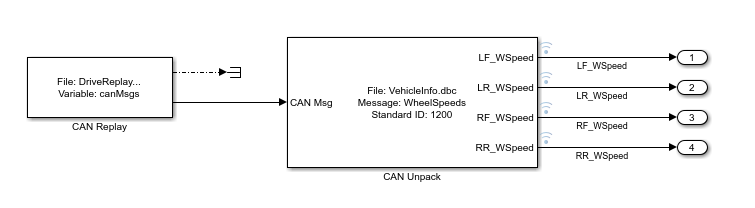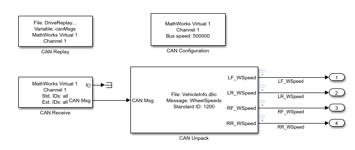 The messages can be decoded via the CAN Unpack block, as in the following diagram. The wheel speed signals can be used as any other Simulink signals in the model, and they are synchronized with the simulation time.