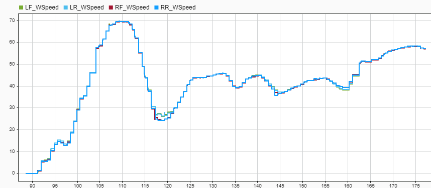One way to mitigate the effect of delays introduced by virtual channels is to use Simulation Pacing Options (Simulink). Upon setting the Simulation time per wall clock second equal to 1, the simulation results for the LF_WSpeed signal are the following: