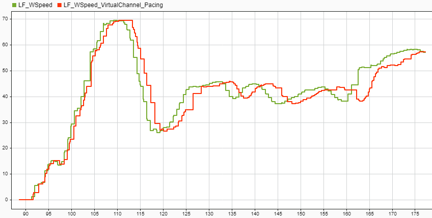The green signal LF_WSpeed indicates the result obtained without using channels or pacing; the red signal LF_WSpeed_VirtualChannel_Pacing is obtained using virtual channels and simulation pacing. There is an evident delay which is introduced by the virtual channel, which cannot be entirely compensated by the usage of simulation pacing.