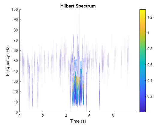 출력 인수 없이 호출될 경우 hht는 진폭에 비례하는 색을 사용하여 신호의 에너지를 시간과 주파수의 함수로 플로팅합니다.